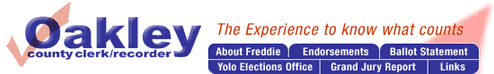 Thank you! About Freddie The Issues The Yolo County Elections Office The Grand Jury Report Endorsements Ballot Statement Links 39598 Lupine Court Davis, California 95616 758-3466 freddie@freddieoakley.com ©Copyright, 2002, Friends of Freddie Oakley, all rights reserved website by: |
