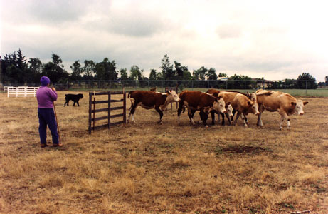 This is a photo of my Bouvier , Bones, herding cattle through a set of panels (equivalent to an open gate, but without fence on either side) in the middle of a field.  To control cattle out in the middle of a field , away from a fence, takes much grater control by the dog.  Cattle like to move along fence lines, following them naturally.  Away from a guiding fence, the dog has to supply all the direction.  Sets of panels such as these are a common trial obstacle to demonstrate the dog's precise control over the movement of the livestock, who could easily divert off to either side. Notice that the heads of the cattle are low and their necks and tails relaxed.  This is how calmly cattle should be moved if you want to maintain weight and mild production. this is an exemplary performance.  Notice also that the dog is very low keyed in his demeanor.