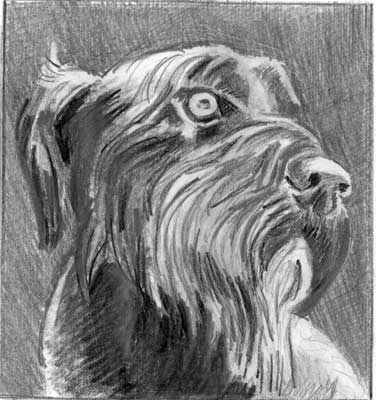 A pencil portrail of Keya, my precious puppy, in 3/4 view. Her eyes were very light, yellowish, which the standard disapproves (for no functional reason) but which gave her face more expressiveness.